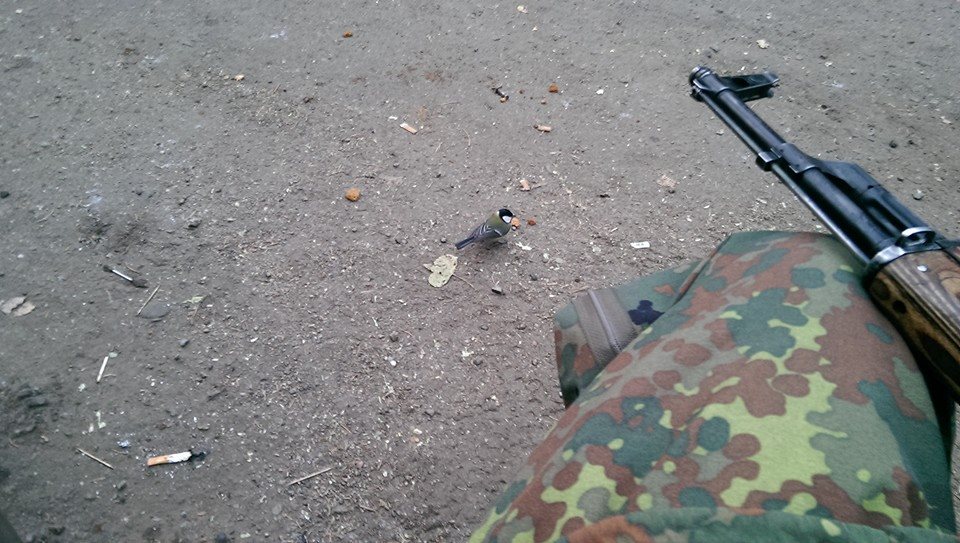 Żołnierz jest cały w moro lub na zielono, ma kask i podkoszulek w paski. Na żołnierzu jest wiele warstw i kieszonek: w każdej kieszonce jest granat, pod kieszonkami – kamizelka kuloodporna, a na twarzy kominiarka. Żołnierz ma zdjęcia na gruzach budynków „tyle zostało z naszego hangaru”, pod dachem przeszytym kulami, na tle pożaru. Gdy za żołnierzem jest ogień, jego twarz jest cierpka, brwi zmarszczone, a oczy przerażone. Bohater drugiego planu – strach. W chwili spokoju – bliskie selfie – pokazuje wyniszczenie organizmu: oczy ma spuchnięte od ciągłego czuwania, czoło spięte, zarost, dużo zarostu. Żołnierz zarasta na froncie. Broda rośnie wraz z doświadczeniem. Gdy żołnierz znajdzie zwierzę, opiekuje się nim. Odcina psa z uwięzi, na której pozostawiła go uciekająca przed frontem rodzina. Oddaje mu swoje mielonki z puszek. Znane są przypadki psów, które pozostają z żołnierzami na dłużej, jak Szarik z „Chetyre tankysta y sobaka”. Małe kotki też się zdarzają.