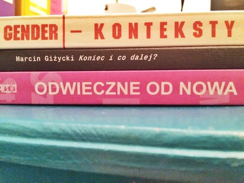 Przyjrzyj się swojej półce z książkami (trans*wersy już tam są, ukryte na grzbietach Twoich książek!). Wybierz kilka książek i zacznij je układać jedna na drugiej, tak by widzieć tytuły umieszczone na grzbietach. Dokładaj nowe, wymieniaj, szukaj takich zestawień, które wpiszą się w tematykę trans*wersów. Długość wiersza zależy od Ciebie.