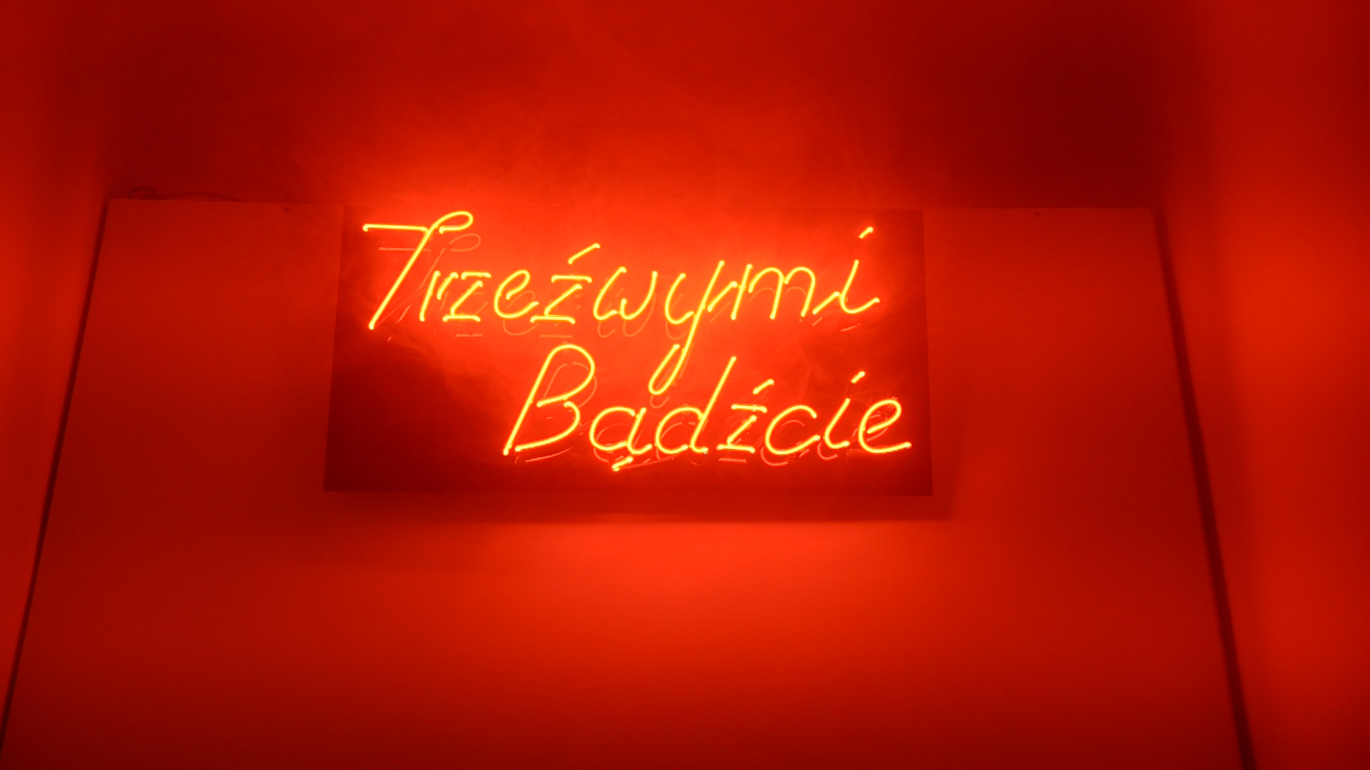 Tytuł wystawy jest także tytułem ich wspólnego dzieła – neonu. Świecące na czerwono zdanie nawiązuje do estetyki barowych szyldów, które mijamy gdy wracamy z nocnych wojaży. Przewrotnie użyta fraza jest cytatem z Biblii, które w pełni brzmi: „Bądźcie trzeźwi! Czuwajcie! Przeciwnik wasz, diabeł, jak lew ryczący krąży szukając kogo pożre.” Ta powstała najwcześniej praca, będąca prezentowaną przez OPCJĘ w galerii Mała Czarna w Łodzi, stała się zaczynem, wokół, którego młodzi artyści budują swoją indywidualną, subiektywną wypowiedź na temat stosunku do alkoholu.